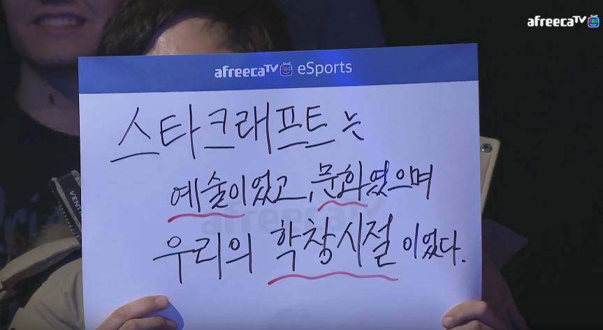 | 17일 리쌍전에서 한 팬이 든 피켓. 스타리그 부활에 대한 열망을 보여준다. <사진=유튜브 아프리카TV 채널 캡처> |