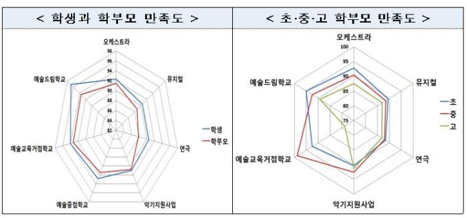 그 결과 지난해 새롭게 지정된 '예술드림학교'의 만족도가 가장 높게 나타났다. 고등학생들의 만족도가 98점을 넘는 등 초중고 학생들의 만족도 평균점수가 96.8점을 기록했다. 학부모들 역시 93.5점을 줬다.
