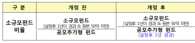 먼저 소규모펀드 비율 산정 기정 방식에서 분모 기준을 1년이 경과한 펀드로 변경했다. 기존에는 공모추가형 펀드로만 제시돼 소규모펀드를 감축하지 않더라도 신규펀드 설정을 늘릴 경우 비율을 낮출 수 있다는 문제점이 있었기 때문이다.