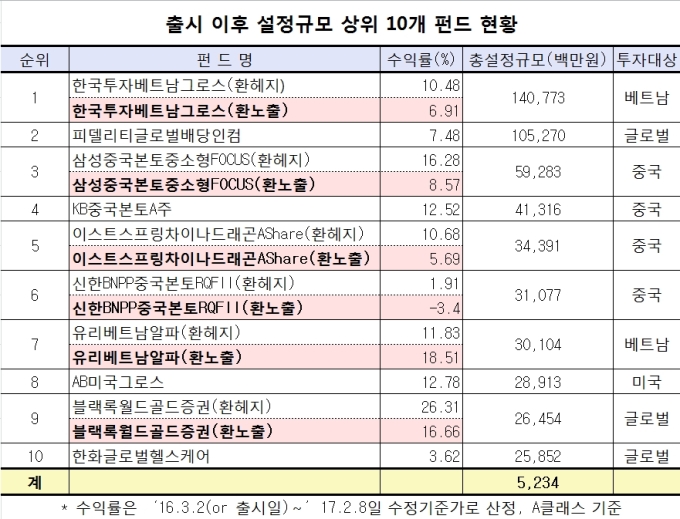 판매규모 상위 10개 펀드에 5234억원이 설정됐다. 전체 판매금액의 48.4%를 차지했다. 투자국가 별로 베트남 1709억원, 중국 1661억원, 글로벌 1576억원, 미국 289억원 순이다.