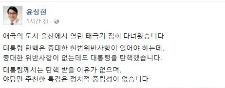 윤상현 의원은 11일 페이스북에 “애국의 도시 울산에서 열린 태극기 집회에 다녀왔다"고 박근혜 대통령 탄핵 반대를 주장했다.