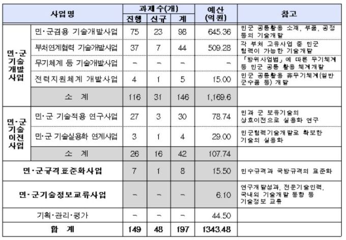 주요 사업은 네 가지 형태로 ▲전자종이를 이용한 능동 위장막 기술개발 등 147개 과제 1170억원 ▲정찰감시용 이륙 중량 110kg급 무인헬기 개발 등 34개 과제 108억원 ▲우수 민수제품의 국방부문 활용을 촉진하기 위한 민‧군 규격 표준화사업 등 8개과제 16억원 ▲국방과학연구소, 민간부문의 정부출연연구소 등이 참여하는 기술정보교류사업 6억원 등이다.