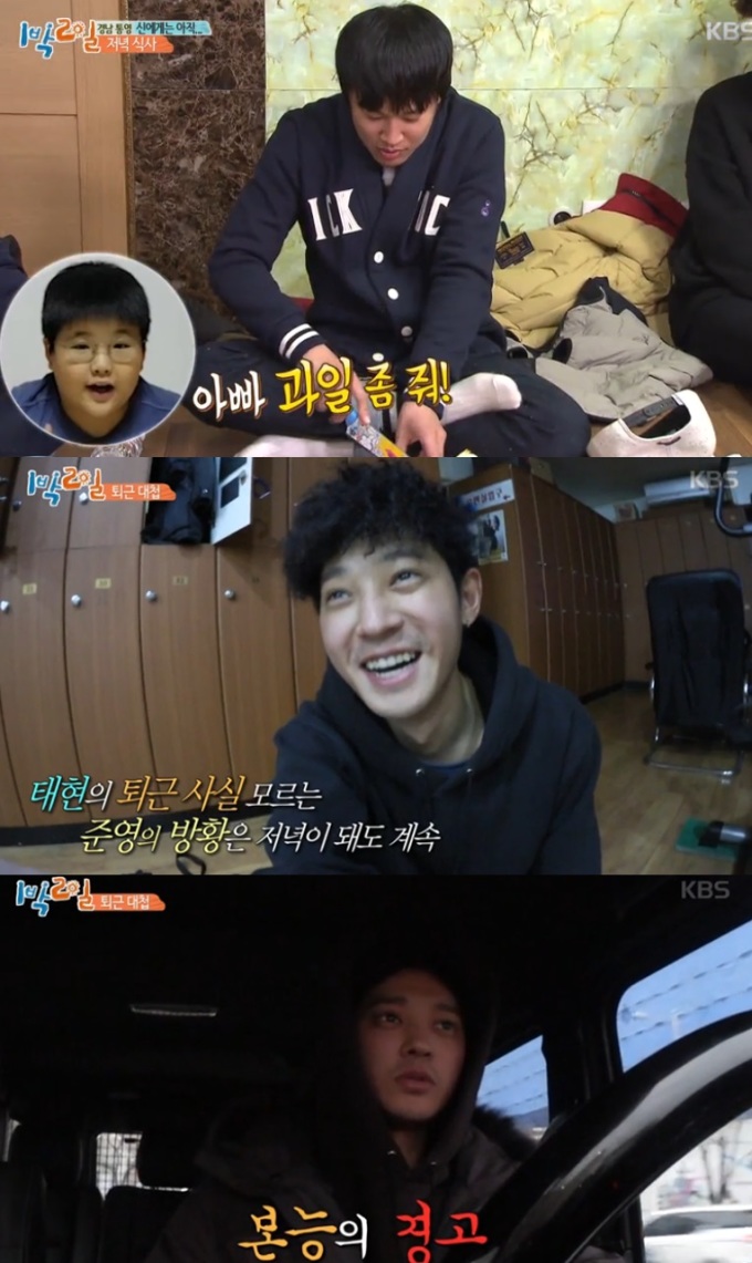 [뉴스핌=정상호 기자] ‘1박2일’ 차태현이 자상한 아빠의 면모를 드러냈다. 승부욕에 불타는 정준영과 윤시윤은 결국 하루를 넘긴 뒤 집으로 귀가해 웃음을 자아냈다.