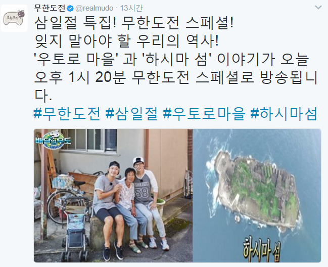 1일 MBC '무한도전' 공식 트위터에는 "삼일절 특집! 무한도전 스페셜! 잊지 말아야 할 우리의 역사! '우토로 마을'과 '하시마 섬' 이야기가 오늘 오후 1시20분 무한도전 스페셜로 방송됩니다 #무한도전 #삼일절 #우토로마을 #하시마섬"이라는 글이 게재됐다.