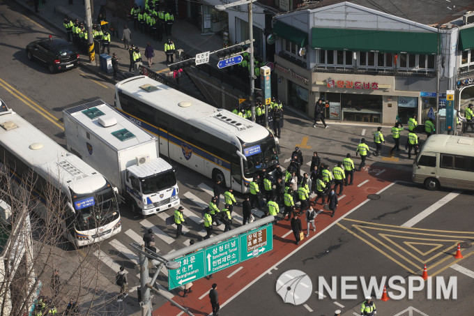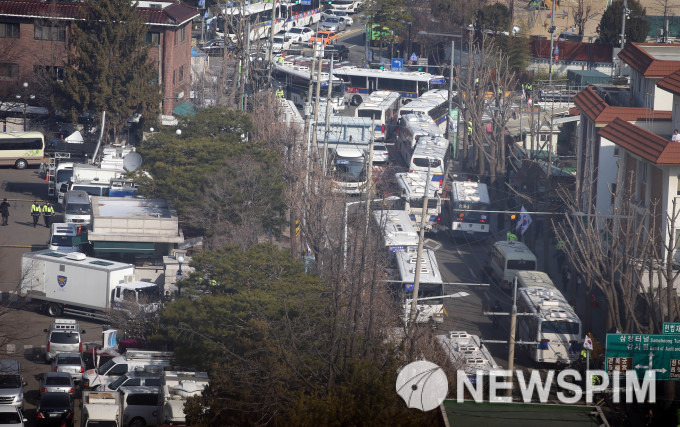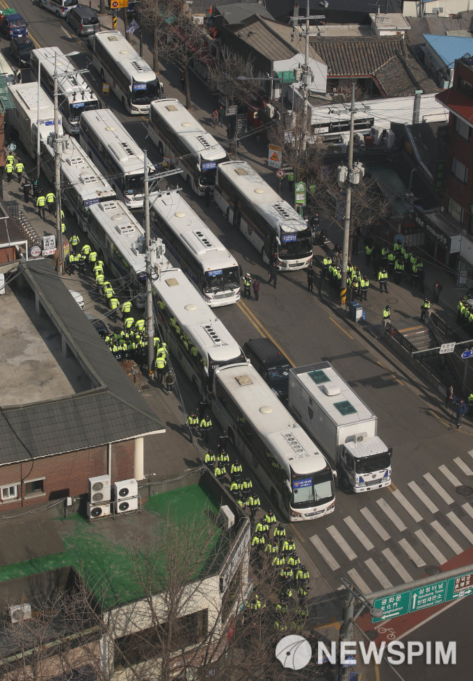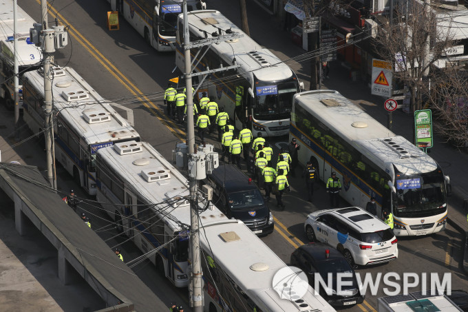 [뉴스핌=김학선 기자] 박근혜 대통령 탄핵심판 최종 선고를 하루 앞둔 9일 오전 서울 종로구 헌법재판소 인근에서 경찰이 헌재로 향하는 도로를 차벽으로 봉쇄하고 있다.