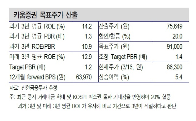 [뉴스핌=이광수 기자] 신한금융투자는 키움증권에 대해 펀더멘털은 견조하나 과도한 기대감은 부담 요인이라고 분석했다. 목표가는 9만원에서 9만1000원으로 상향했지만, 투자의견은 매수(BUY)에서 'Trading BUY'로 하향조정했다.