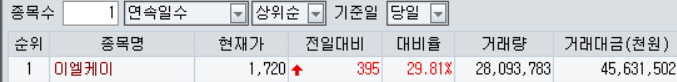 이날 코스닥 시장에서 이엘케이는 자회사 두모전자가 2011년 이후 5년간 25배 매출신장했다는 소식이 알려지며 29.81% 오른 1720원에 마감했다.