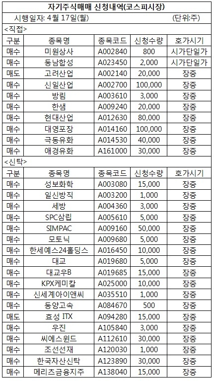 [ 뉴스핌=심지혜 기자 ] 다음은 17일 코스피시장 자기주식매매 신청내역이다.