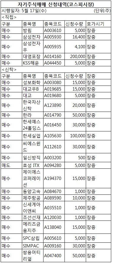 [뉴스핌=함지현 기자] 다음은 17일 코스피시장 자기주식매매 신청내역이다.