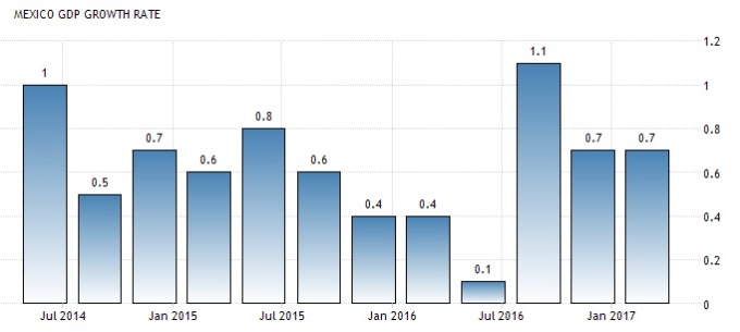 멕시코 국내총생산(GDP)은 올해 1분기에 전분기 대비 0.7% 성장했다. 작년 같은 기간에 비해서는 2.8% 성장했다. 이는 전문가 예상치인 2.7%와 작년 4분기의 2.3% 성장을 모두 웃도는 수치다.