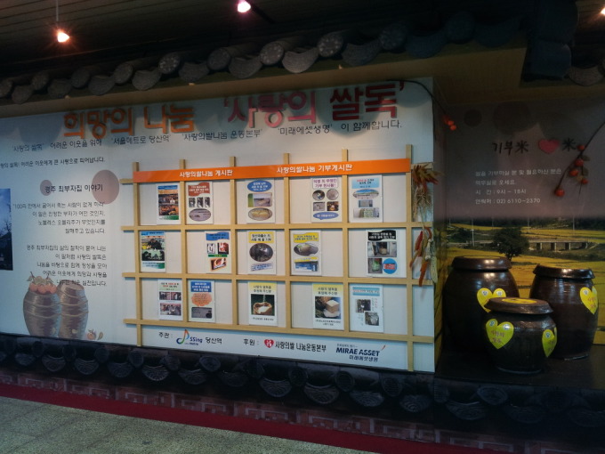| 지난해 12월 서울 지하철 2호선 당산역에 설치된 '사랑의 쌀독' 모습. 벽면에 쌀을 기부한 시민과 기업의 사진이 붙어 있다. [사랑의쌀나눔운동본부 홈페이지] |
