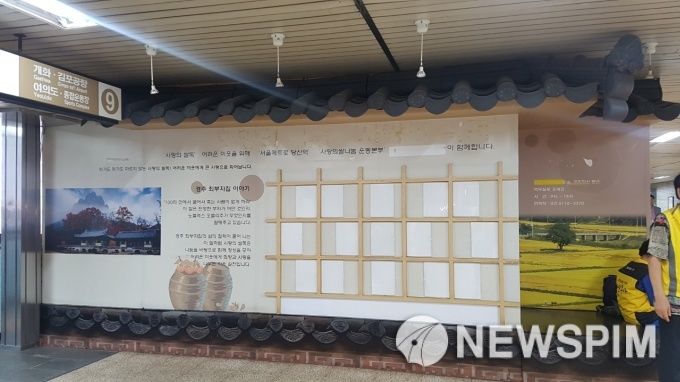 14일 뉴스핌이 찾은 서울 지하철 2호선 당산역. 개찰구 안쪽 '사랑의 쌀독' 자리에는 관련 사업을 설명하는 글만 벽에 덩그러니 붙어있을 뿐, 있어야 할 쌀독은 없었다.