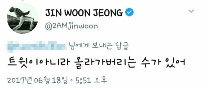 그러자 정진운은 이 네티즌에게 "트윗이 아니라 올라가버리는 수가 있어"라는 멘션을 보내 웃음을 줬다. 정진운은 앞서서도 자신의 이름을 언급한 트위터리안에게 멘션을 보내며 '트잉여'임을 인증한 적이 있다.