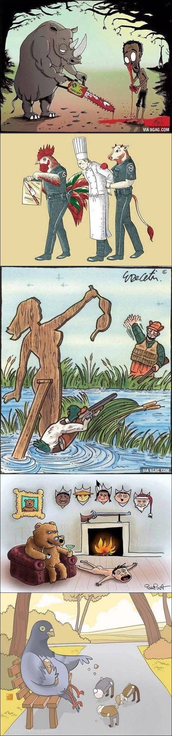 해당 사진은 홍콩 웹사이트 9gag와 해외커뮤니티에 실린 게시물로 인간이 동물을 상대로 한 잔인한 행동을 담고 있다. 눈여겨볼만한 점은 사람과 동물의 모습을 바꿔 그렸다는 것이다.