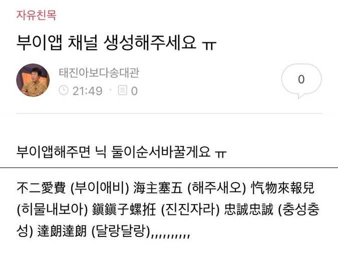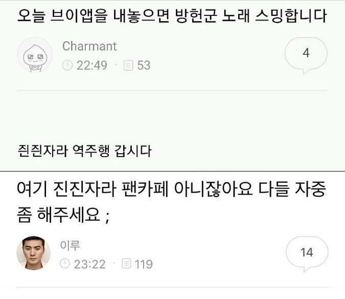 워너원 팬들은 '프로듀스101 시즌2' 탈락자들도 하는 네이버V앱에서 아직 워너원의 소식이 없는 것에 항의했다. 이 과정에서 태진아의 사진을 올리며 "브이앱 해주면 닉 순서 바꾼다"는 글이 올라왔다. 이 사용자의 닉네임은 '태진아보다송대관'. 자신의 요구를 들어주면 '송대관보다 태진아'로 이름을 바꾸겠다는 웃픈(?) 협박이다.