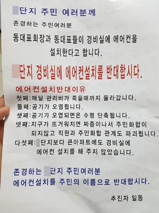 [뉴스핌=정상호 기자] 서울의 한 아파트에서 ‘경비실 에어컨 설치 반대’ 전단으로 논란이 일어난 가운데, 이 아파트의 또 다른 주민이 쓴 ‘사이다 반박글’이 화제다.
