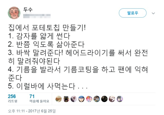 한 트위터리안은 '집에서 포테토칩 만들기!'라며 거창하게 방법을 설명했지만 끝내 웃음만 남겼다.