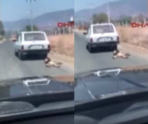 공개된 영상에는 도로에서 밧줄에 묶인 강아지 한 마리가 질주하는 자동차 뒤에 매달려 끌려가는 장면이 담겨졌다.