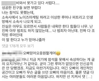 이어 "난 진짜 아무 범죄도 하지 않았는데 나 범죄자 아닌데. 진짜 다 조작된 루머인데 이 말 한다고 누가 믿어나 줄까"라고 덧붙였다. 현재 이 글은 SNS에서 삭제된 상태다.