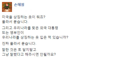 손혜원 의원은 지난 2일 자신의 페이스북에 “미국을 상징하는 옷이 뭐죠? 몰라서 묻습니다”라는 글을 올렸다.