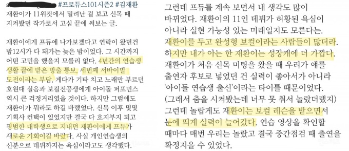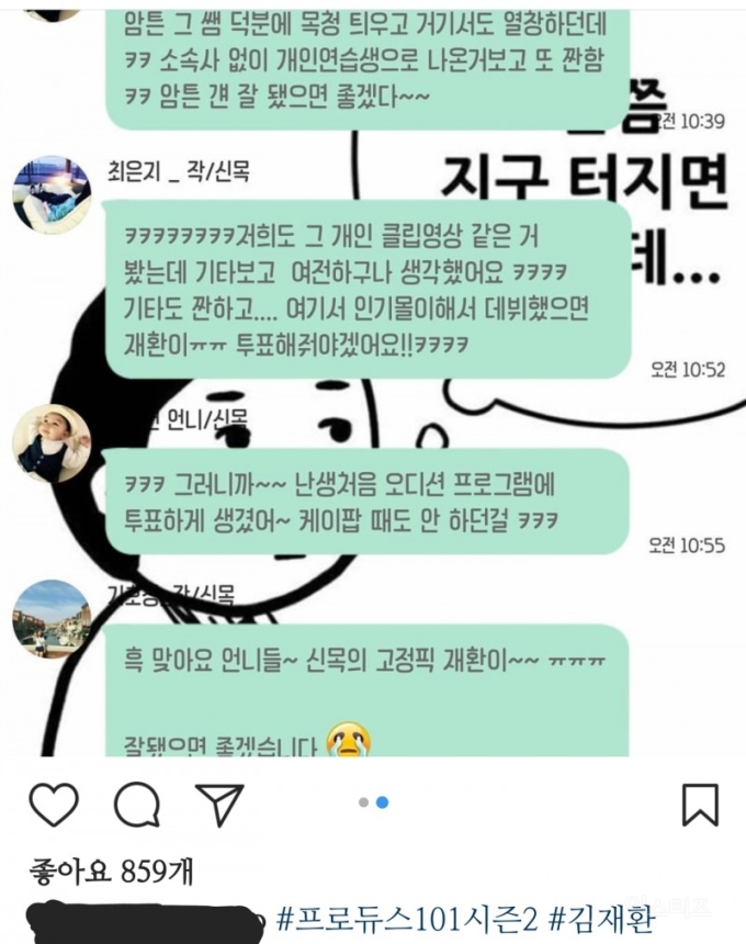 여러 명으로 추정되는 작가들은 이후에도 SNS에 투표 독려와 모바일 메신저 창을 캡처해 올리며 김재환을 응원했다. 이들은 과거 소속사에 들어갔지만 4년을 보낸 뒤 결국 나오게 되고, '신의 목소리'에서 실력을 인정받았지만 좀처럼 좋은 기회와 연결되지 못한 김재환을 안타까워했다.