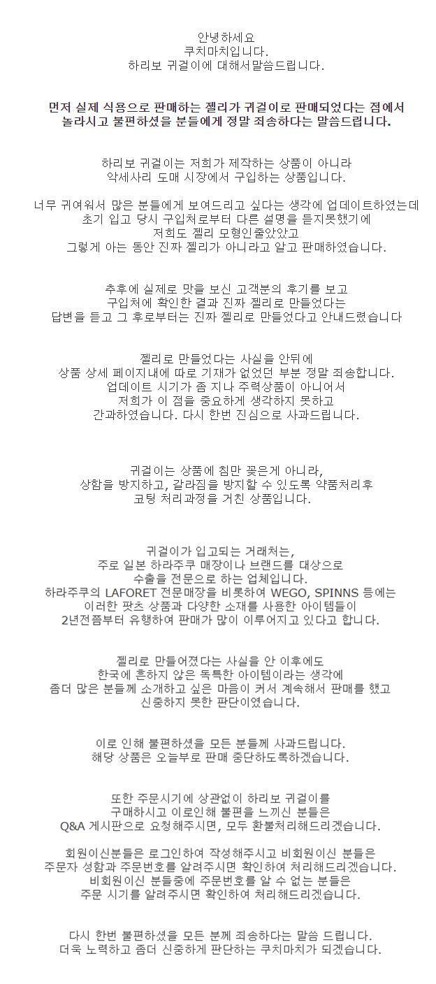 4일 하리보 젤리 귀걸이를 판매한 쇼핑몰 쿠치마치 측은 "하리보 귀걸이에 대한 설명과 사과의 말씀 드립니다"라며 장문의 글을 게재했다.
