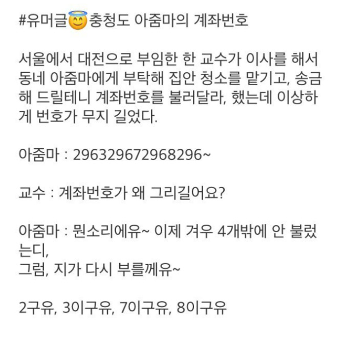 글에 따르면 서울에서 대전으로 부임한 한 교수가 이사를 해서 동네 아줌마에게 부탁해 집안 청소를 맡기고, 송금할테니 계좌번호를 불러달라고 했는데 이상하게 번호가 길었다.