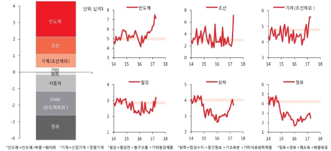 여기에 반도체 의존도가 심한 수출 구조는 가장 큰 리스크 요인이라고 강조했다. 현재 수출 호조는 반도체 선박 등이 주도하고 있고, 나머지 자동차, 화학, 정유 등 부문에선 마이너스 증가율이라는 설명이다. 결국, 삼성전자 등 반도체 수출기업 중심의 호황이었다는 평가다.