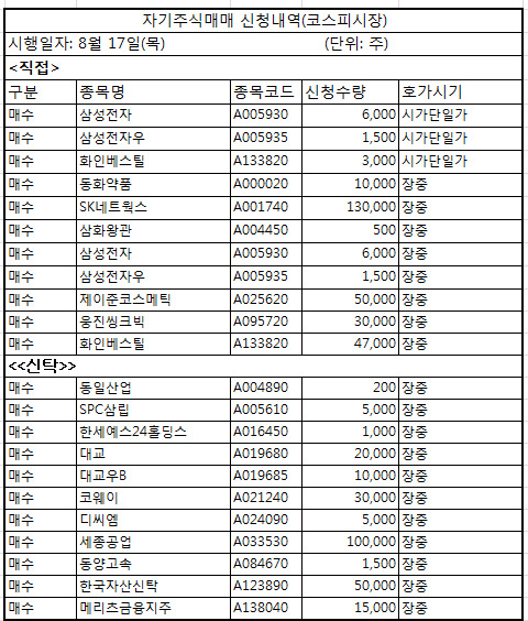 [뉴스핌=조한송 기자] 다음은 17일 코스피시장 자기주식매매 신청내역이다.
