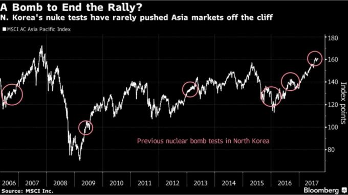 7일 자 블룸버그통신 등은 올해 들어 한반도에서 긴장감이 돌자 그동안 반응이 없던 투자자들이 이제 충돌이라는 최악의 시나리오를 벗어나기 위해 한반도 리스크를 저울질하기 시작했다고 보도했다.