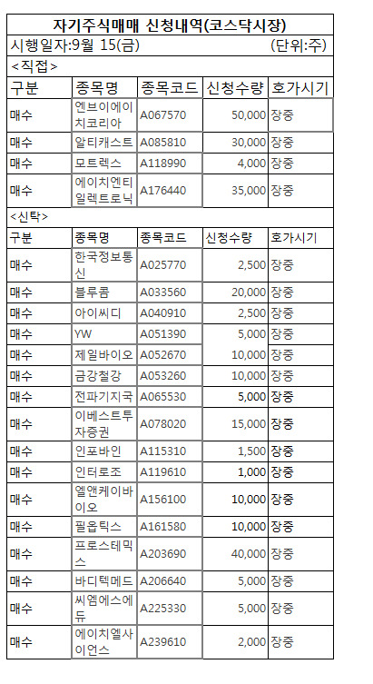 [뉴스핌=김지유 기자] 다음은 15일 코스닥시장 자기주식매매 신청내역이다.