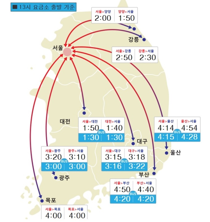 한국도로공사는 오후 1시 요금소 출발 기준으로 서울에서 대전까지 1시간 50분 ▲부산까지 4시간 50분 ▲광주 3시간 20분 ▲강릉 2시간 50분 ▲목포까지는 4시간이 걸릴 것으로 예상했다.