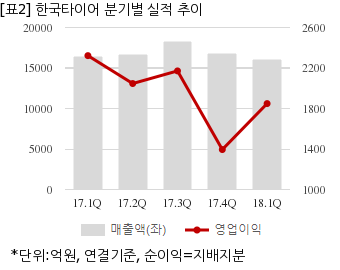 한국타이어는 올해 1분기 연결기준 매출액이 1조6091억원으로 전년 동기 1조6391억원 대비 1.8% 감소했다. 같은기간 영업이익은 1848억4844만원으로 전년 동기 2322억1247만원 대비 20.4% 줄었다. 지배지분 순이익은 1532억7797만원으로 전년 동기 1674억7081만원 대비 8.4% 감소했다.