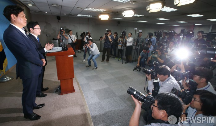 [서울=뉴스핌] 최상수 기자 = 박범계 더불어민주당 수석대변인이 4일 오전 서울 여의도 국회 정론관에서 당 대표 출마 선언 기자회견을 갖고 있다. 2018.07.04 kilroy023@newspim.com