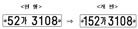 이에 따라 현행 두자릿수인 자동차 번호판 앞자리 숫자가 세자리로 바뀐다. 예를 들어 지금은 '52가 XXXX' 방식으로 번호판이 제작됐지만 내년 9월부터는 '152가 XXXX' 형식으로 바뀌게 된다.