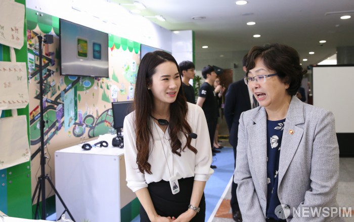 [서울=뉴스핌] 최상수 기자 = 김은경 환경부장관이 5일 오후 서울 여의도 국회의원회관 로비에서 열린 2018 친환경 생활제품 전시회에서 제품 설명을 듣고 있다. 2018.07.05 kilroy023@newspim.com