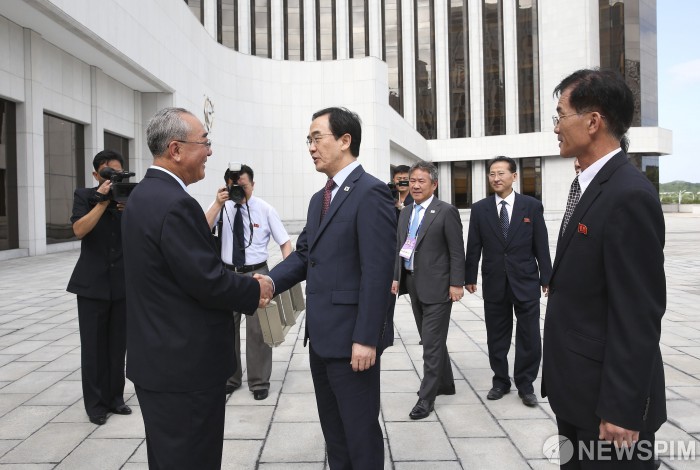 [평양=뉴스핌] 사진공동취재단 = 조명균 통일부 장관이 6일 오전 평양 만경대학생소년궁전을 방문해 렴윤학 만경대학생소년궁전 총장(왼쪽)과 악수하고 있다. 2018.07.06