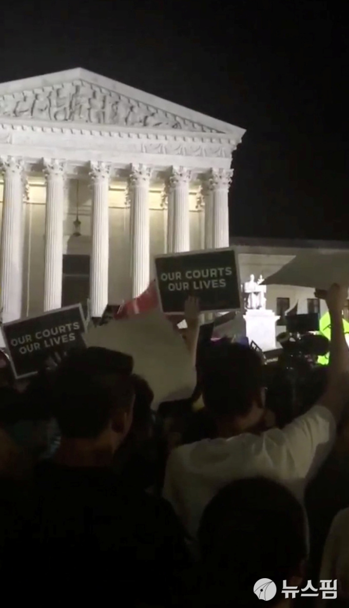 | [워싱턴 로이터=뉴스핌] 권지언 기자 = 9일(현지시각) 워싱턴 연방대법원 앞에서 사람들이 '우리의 법원, 우리의 삶'이라는 시위 피켓을 들고 있다. |