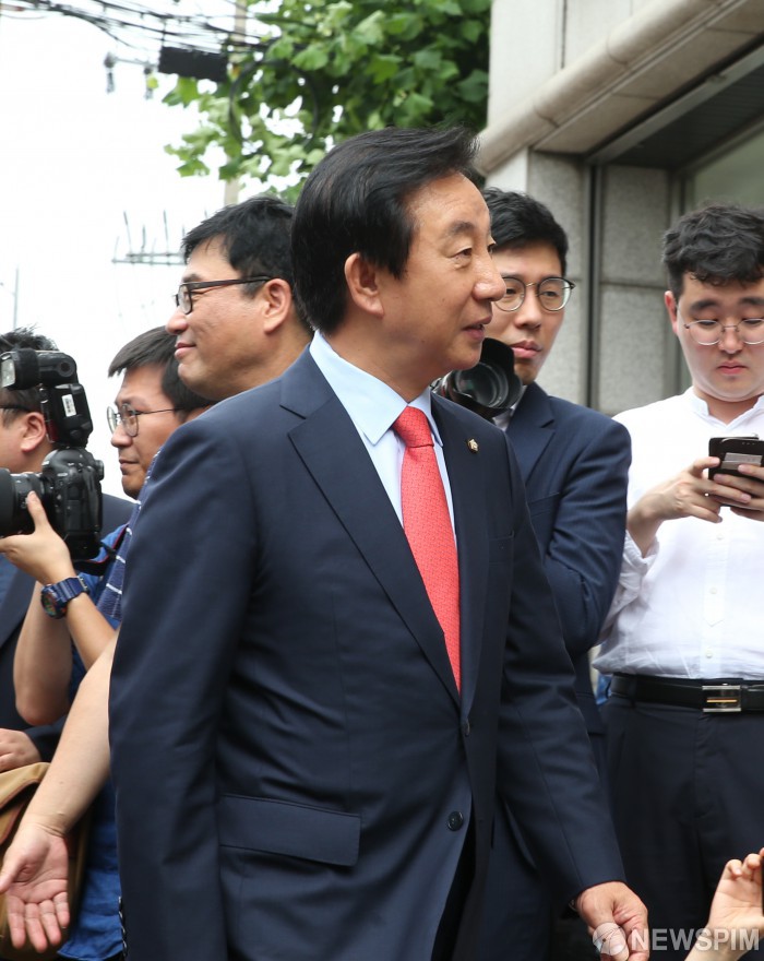 [서울=뉴스핌] 최상수 기자 = 김성태 자유한국당 대표권한대행 겸 원내대표가 11일 오후 서울 영등포구 우성빌딩 앞에서 열린 자유한국당 신 당사 현판 제막식에 참석하고 있다. 2018.07.11 kilroy023@newspim.com
