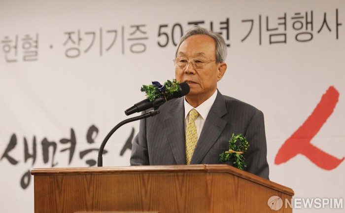 [서울=뉴스핌] 이윤청 기자 = 사랑의 장기기증 운동본부 박관용 명예이사장이 23일 오후 서울 종로구 세종문화회관 세종홀에서 열린 '생명나눔 50주년 기념행사'에서 인사말을 하고 있다. 이번 행사는 피를 뽑으면 돈을 주던 1968년 처음으로 헌혈 운동이 시작된 것을 기념하기 위해 기획됐다. 이날 박 이사장의 책 '생명을 살리며 사랑을 전하다' 출판기념회도 함께 진행됐다. 2018.07.23 deepblue@newspim.com