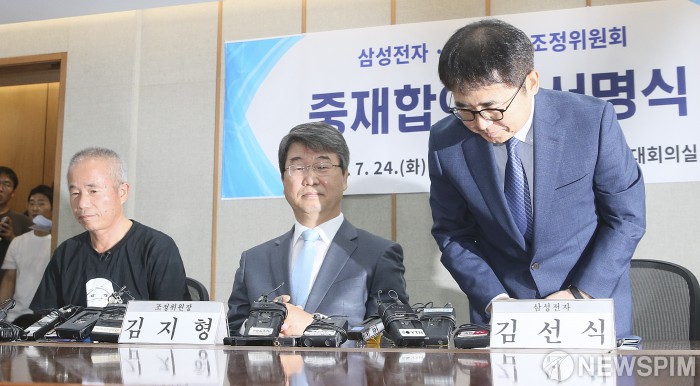 [서울=뉴스핌] 이형석 기자 = 김선식 삼성전자 전무가 24일 오전 서울 서대문구 법무법인 지평에서 열린 '삼성전자‧반올림간 제2차 조정재개를 위한 중재합의서 서명식‘에서 허리숙여 인사 하고 있다. 2018.07.24 leehs@newspim.com