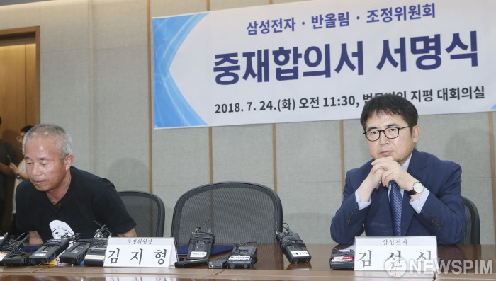 [서울=뉴스핌] 이형석 기자 = 황상기 반올림 대표(왼쪽부터)와 김선식 삼성전자 전무가 24일 오전 서울 서대문구 법무법인 지평에서 열린 '삼성전자‧반올림간 제2차 조정재개를 위한 중재합의서 서명식‘에 참석해 자리에 앉아 있다. 2018.07.24 leehs@newspim.com