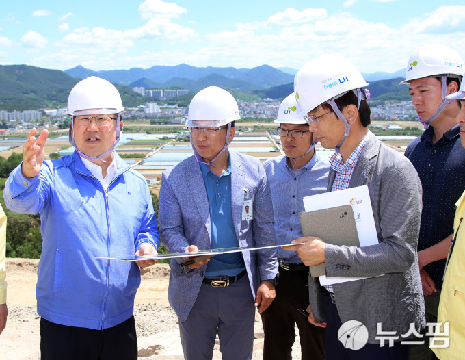 | 박일호 밀양시장(왼쪽)이 지난해 5월 25일 나노연구단지 부지조성공사 현장을 방문해 공사 추진현황을 살펴보고 있다.[제공=미양시청] 2017.5.25. |