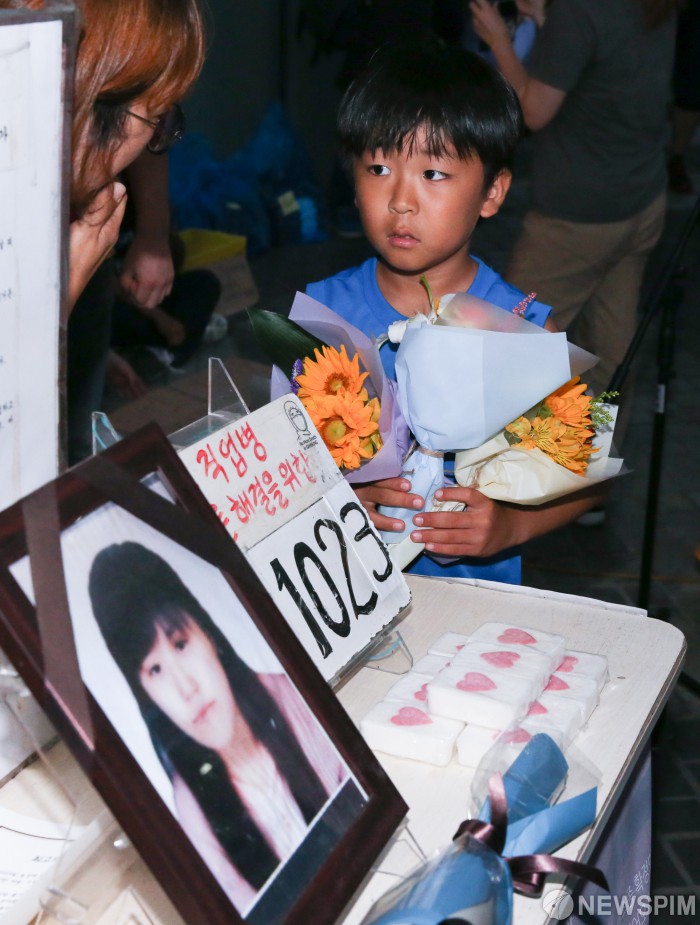 [서울=뉴스핌] 최상수 기자 = 25일 오후 서초구 삼성전자 서초사옥 앞에서 열린 반올림(반도체 노동자의 건강과 인권지킴이) 농성 해단식에서 한 어린이가 고(故) 황유미씨를 추모하기 위한 꽃다발을 들고 있다. 1023일간 지속된 농성은 지난 24일 삼성전자와 반올림 간에 중재합의를 통해 마무리됐다. 2018.07.25 kilroy023@newspim.com