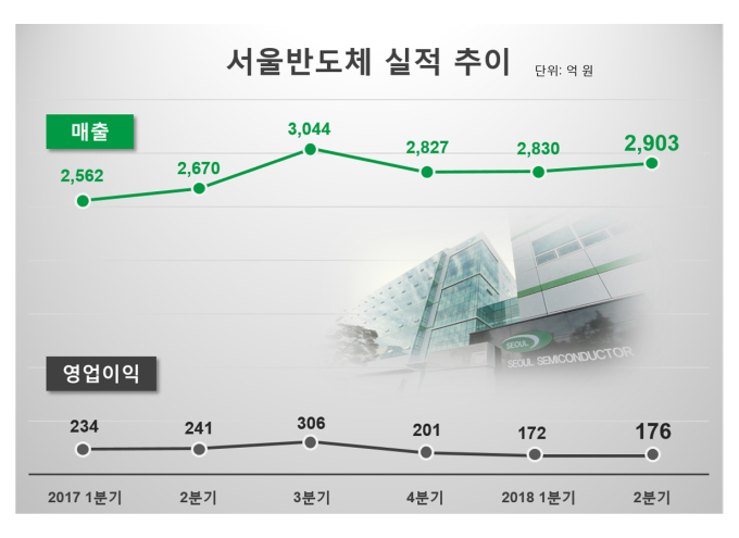 [서울=뉴스핌] 양태훈 기자 = 국내 발광다이오드(LED) 전문기업 서울반도체는 27일 2분기 매출 2903억원, 영업이익 176억원을 공시했다.