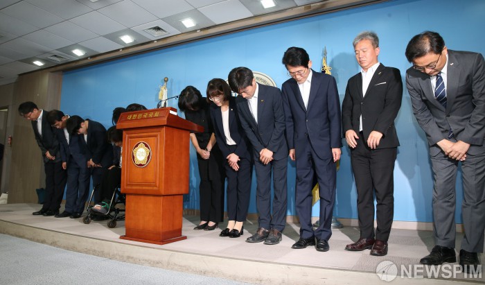 [서울=뉴스핌] 최상수 기자 = 이정미 정의당 대표 및 의원들이 30일 오전 서울 여의도 국회 정론관에서 고(故) 노회찬 정의당 원내대표에 대한 추모에 국민께 감사 인사를 하고 있다. 2018.07.30 kilroy023@newspim.com