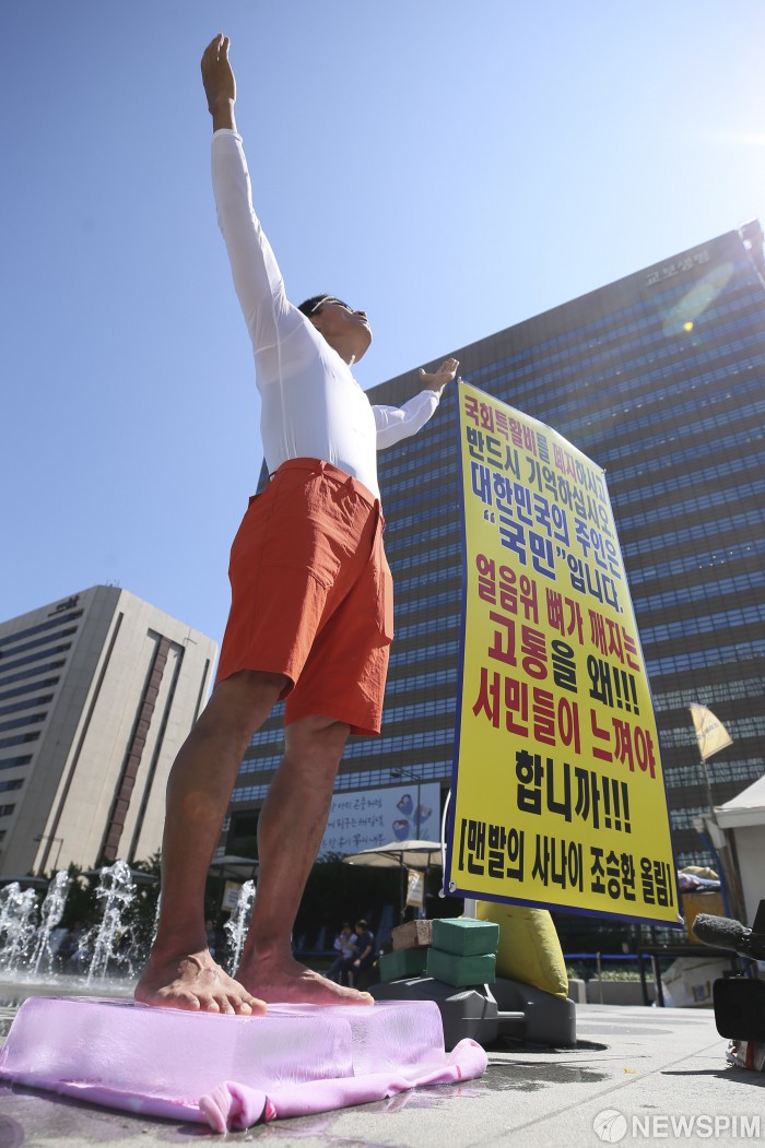 [서울=뉴스핌] 이형석 기자 = 맨발의 사나이 조승환씨가 31일 오전 서울 종로구 광화문광장에서 국회 특활비 폐지를 촉구하며 얼음 위에 올라 시위를 하고 있다. 2018.07.31 leehs@newspim.com