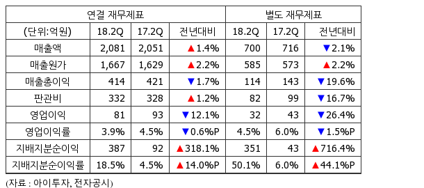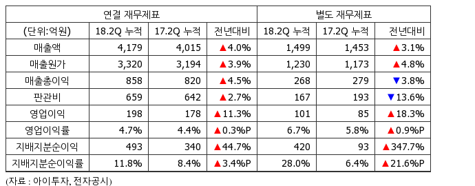 올해 2분기 누적 기준 연결 매출액은 4179억2771만원으로 전년 동기 4015억6659만원 대비 4% 늘었다.