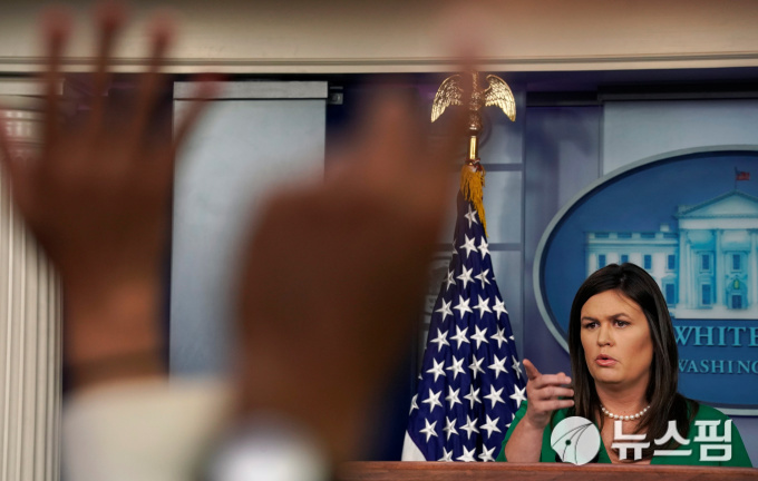 | [워싱턴 로이터=뉴스핌] 최원진 기자= 15일(현지시간) 새라 허커비 샌더스 백악관 대변인이 정례 브리핑에서 심드렁한 표정으로 질문받을 기자를 지목하고 있다. 2018.08.15. |