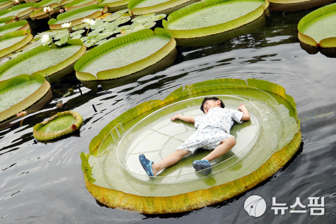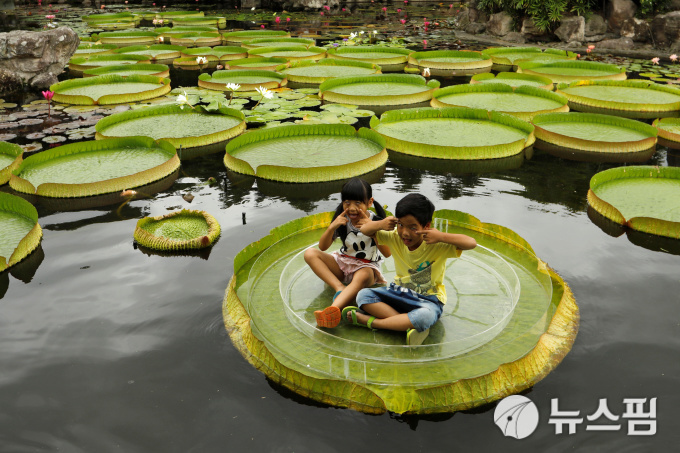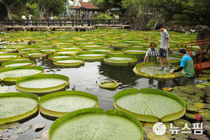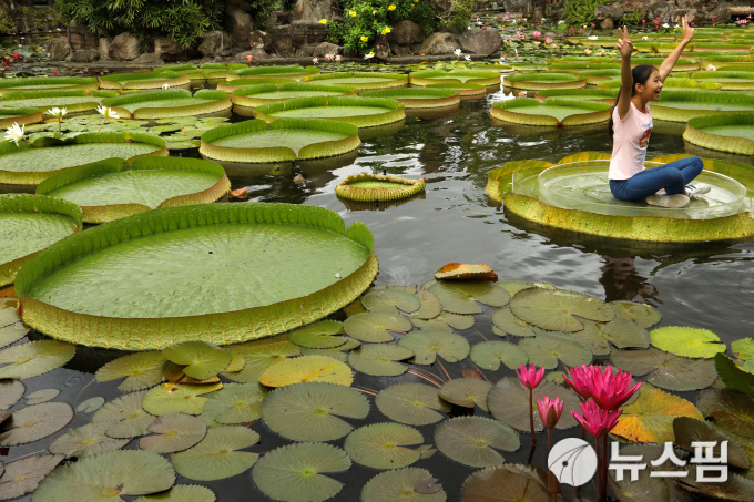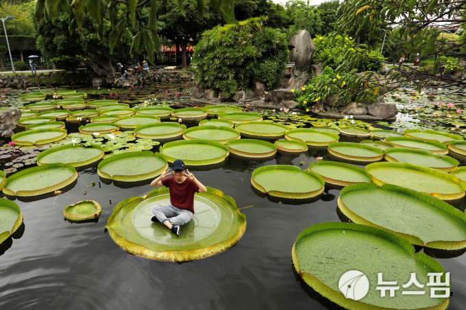 [타이베이 로이터=뉴스핌] 신유리 인턴기자 = 대만 타이베이시에서 시민들이 거대 수련 위에 앉는 연례 행사가 열렸다고 로이터통신이 16일(현지시각) 보도했다.